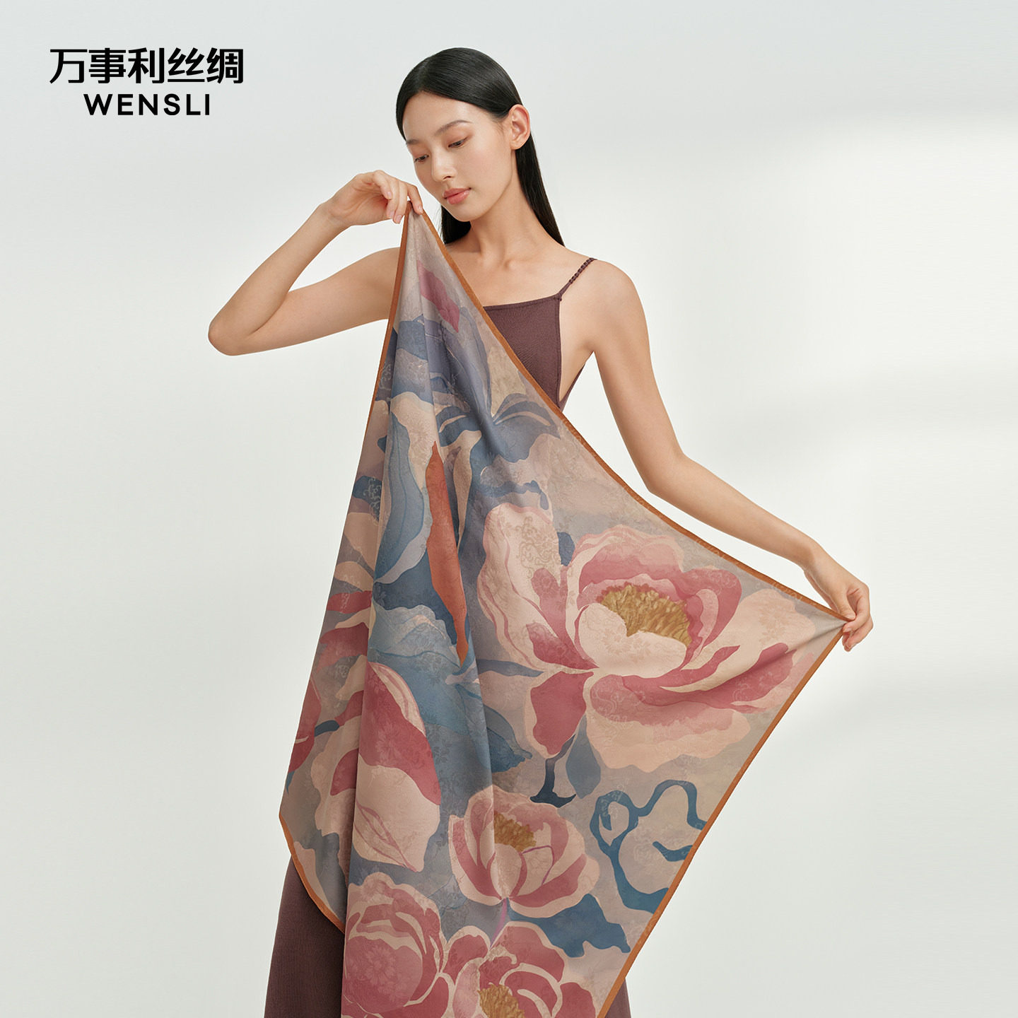 万事利新款100%桑蚕丝真丝丝巾重磅牡丹提花披肩礼物大方巾林南辞