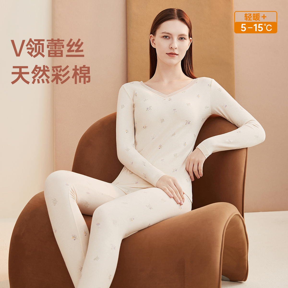 顶呱呱彩棉保暖内衣女圆领全棉中厚打底秋衣秋裤纯棉套装青年女士