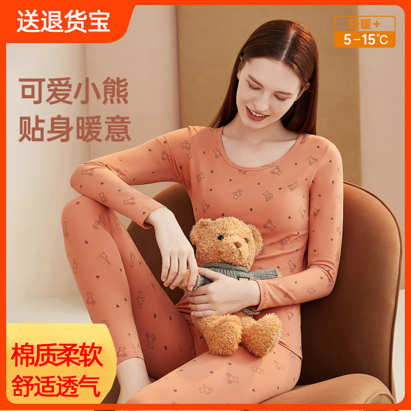 顶呱呱内衣套装圆领小熊印花修身薄款秋衣秋裤女顶瓜瓜打底线衣裤
