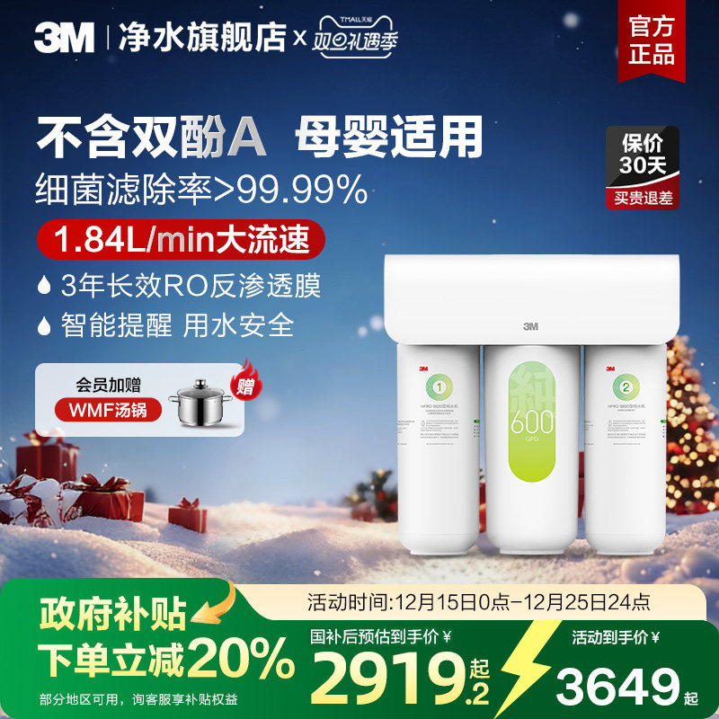 【政府补贴】3M净水器家用直饮自来水厨下过滤RO反渗透纯水机S620