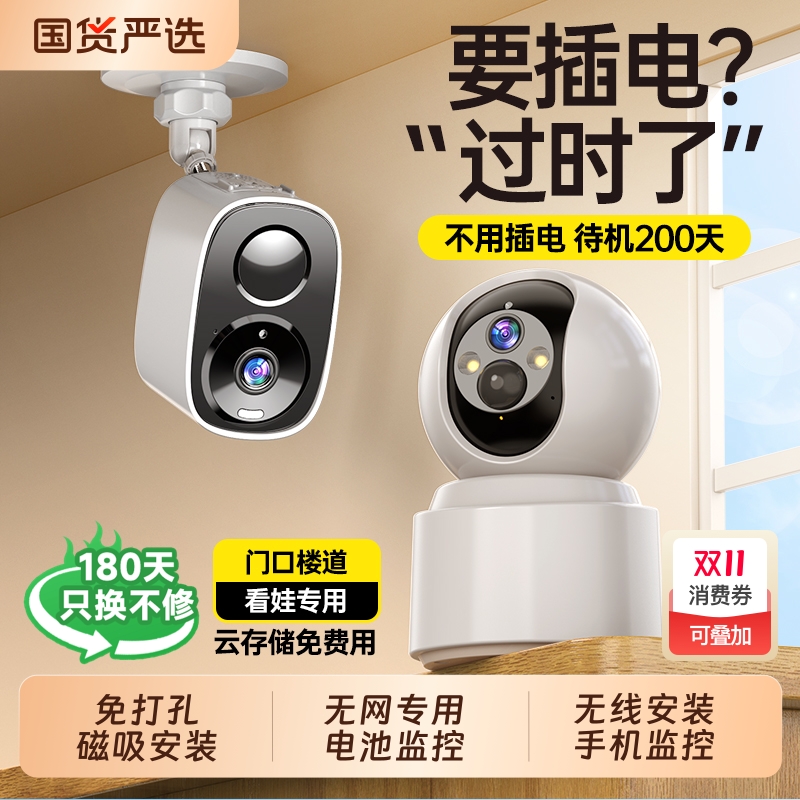 免插电摄像头无需网络无线手机远程高清夜视家用摄影头免打孔智能4G监控器WIFI室内外套装家庭门口充电录像机