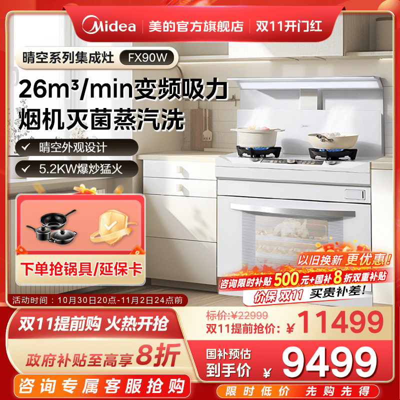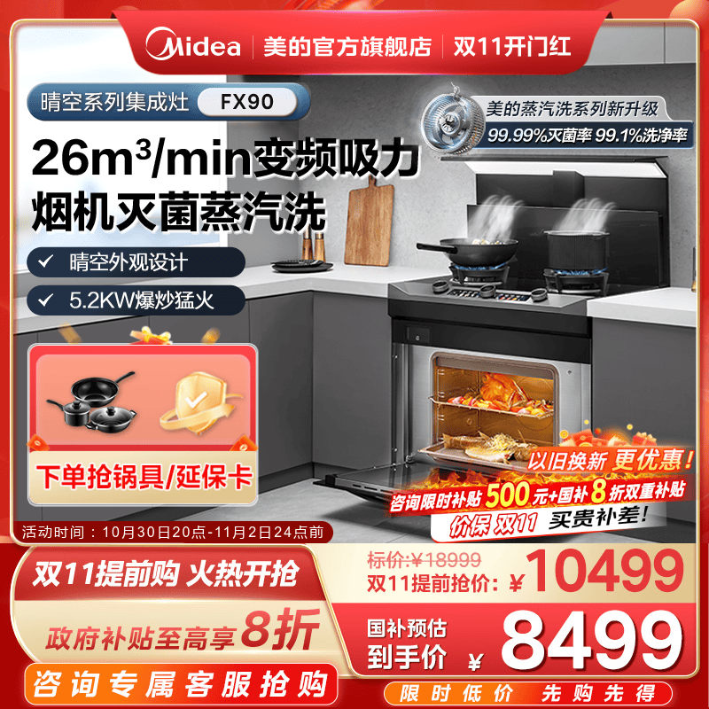国家补贴]美的晴空FX90W集成灶家用蒸烤一体烟机蒸汽洗官方旗舰店