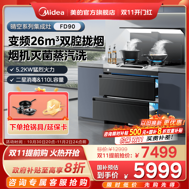 国家补贴]美的晴空FD90集成灶家用消储一体烟机消毒柜官方旗舰店