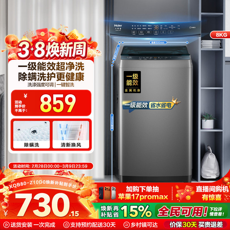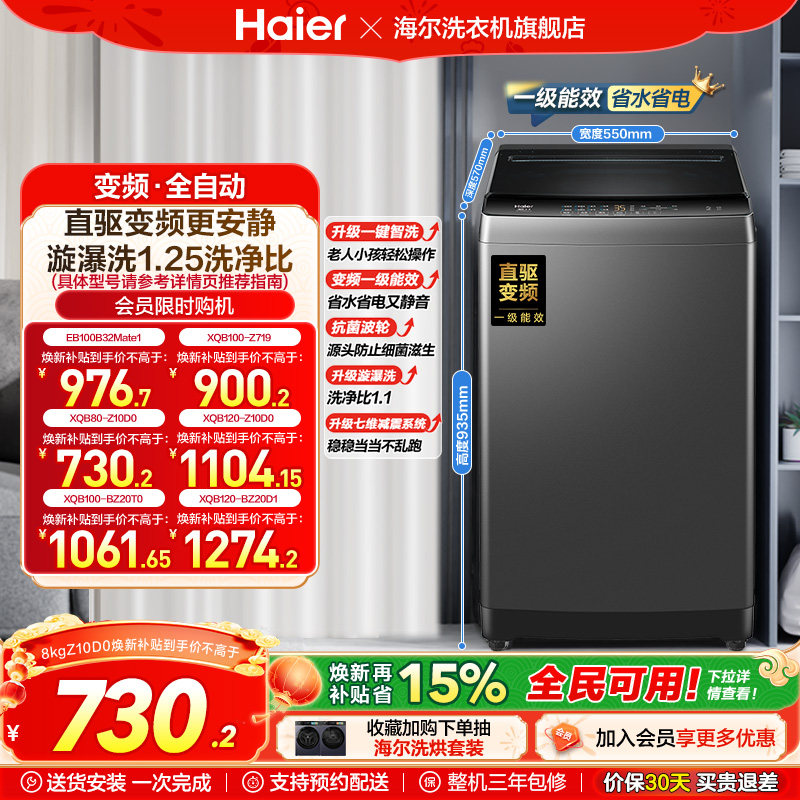 海尔8kg洗衣机10公斤全自动7KG家用波轮洗衣机直驱变频12一级能效