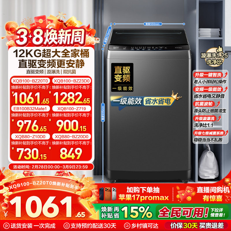 以旧换新 海尔机波轮洗衣机大容量全自动家用8/10/12KG变频20D1