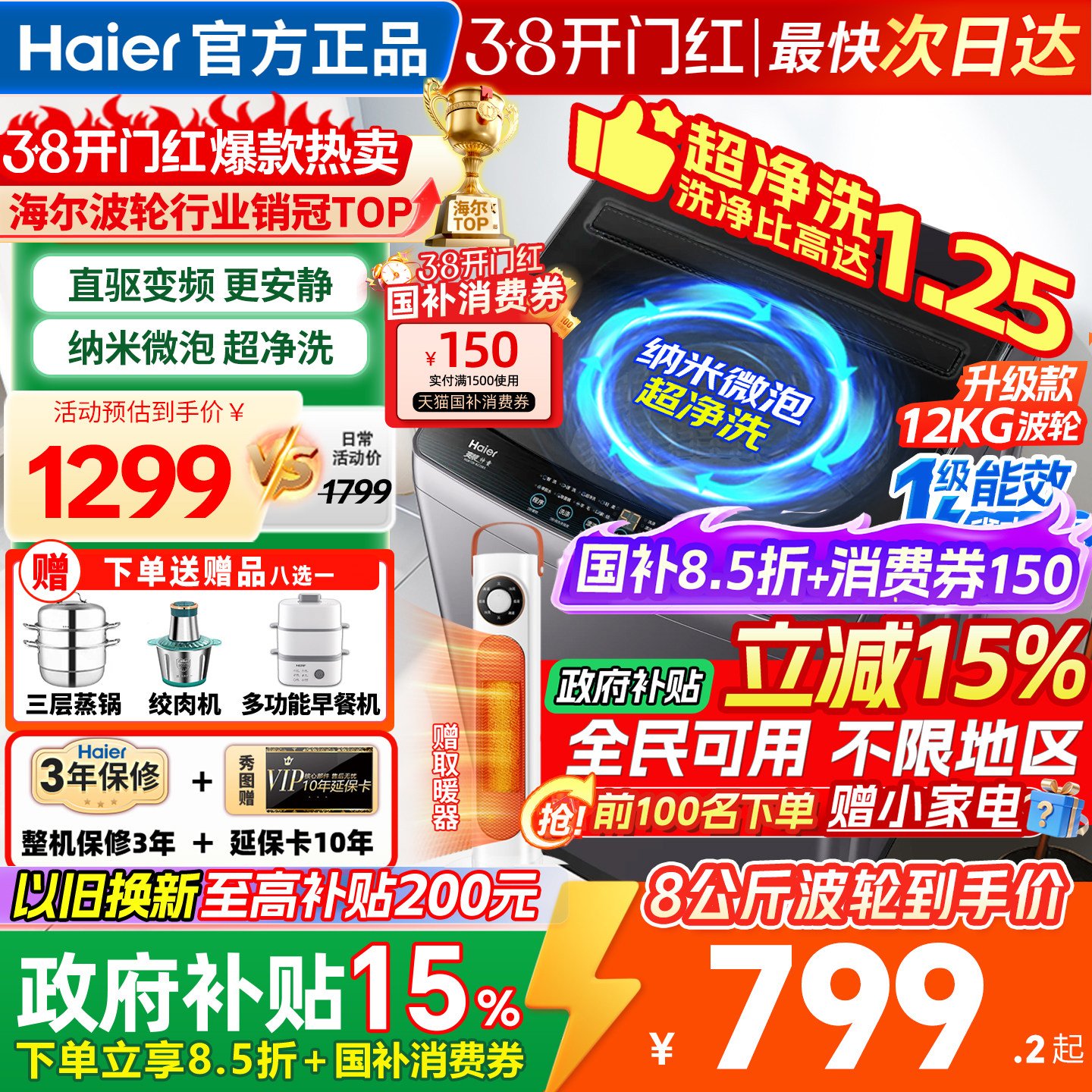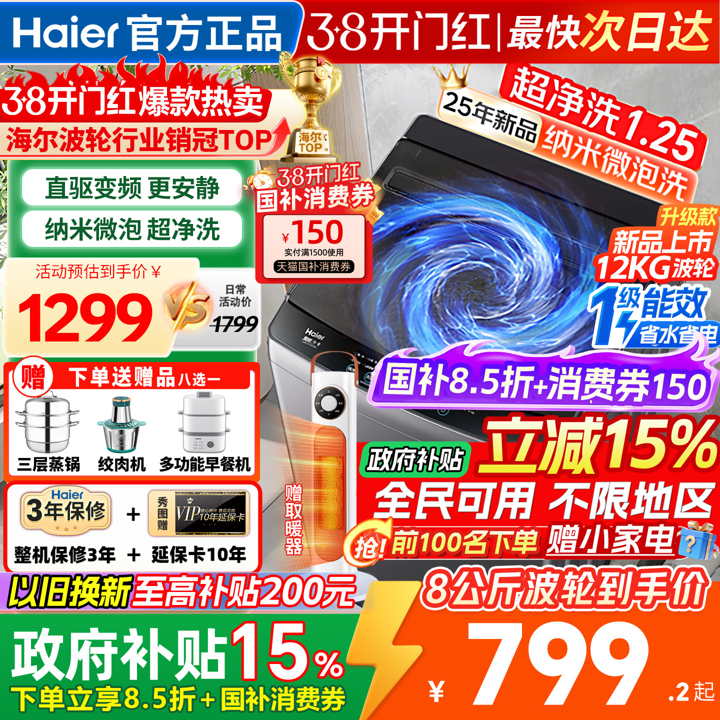 全民补贴海尔leader统帅10/12kg滚筒洗衣机全自动家用洗烘大容量