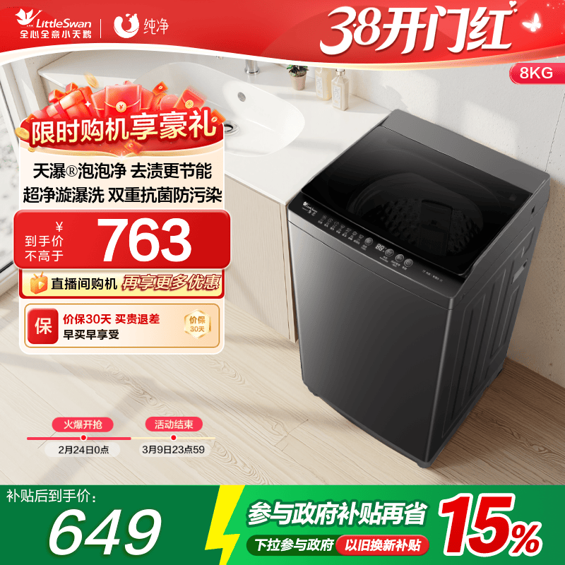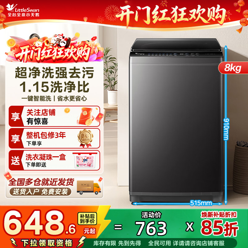 小天鹅洗衣机全自动智能洗脱租房宿舍家用8KG变频大容量波轮28