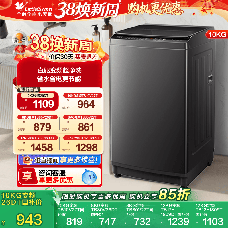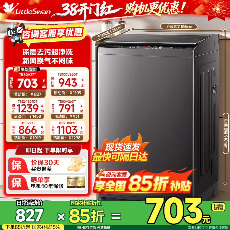 以旧换新 小天鹅波轮洗衣机大容量家用全自动8/10/12KG变频26DT