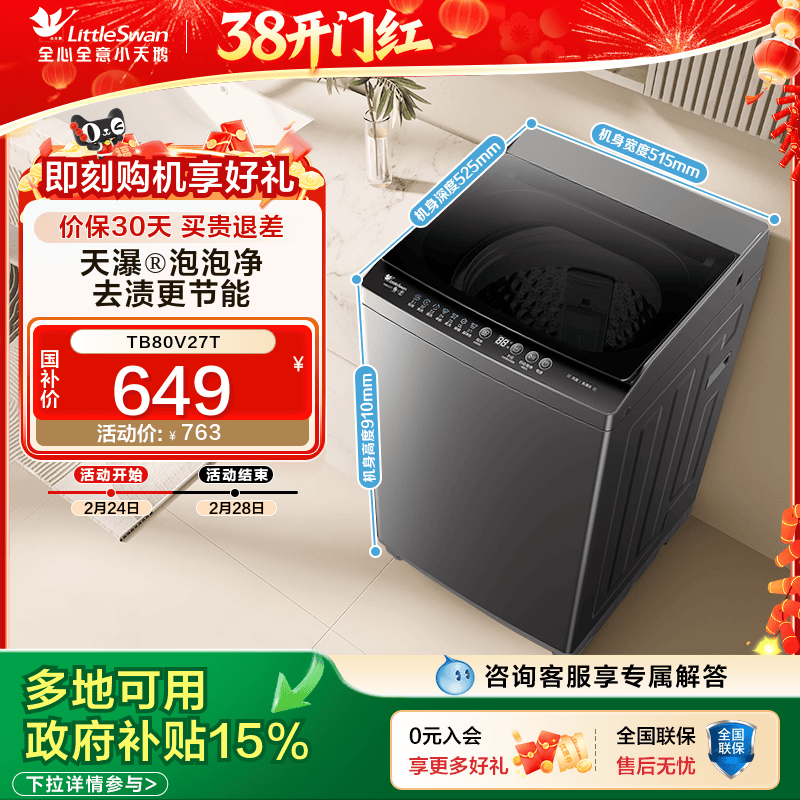 [纯净]小天鹅洗衣机8KG全自动波轮租房宿舍家用大容量洗衣机V27T