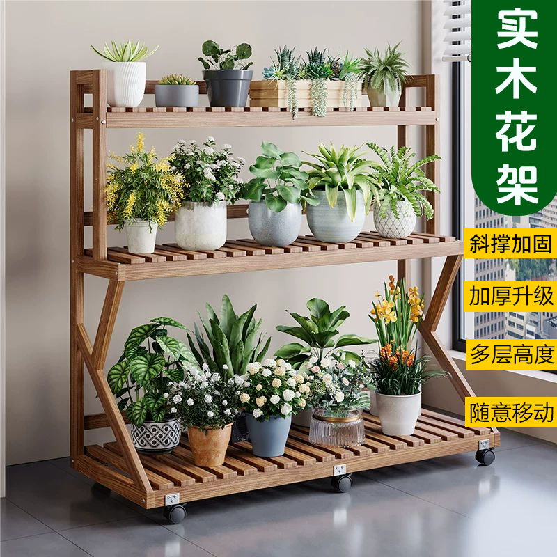 室内全实木简约花架阳台落地多层花盆架子客厅沙发旁可移动置物架