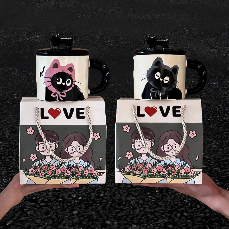 七夕情人节情侣款杯子一对马克杯男女生家用陶瓷杯带盖勺水杯茶杯