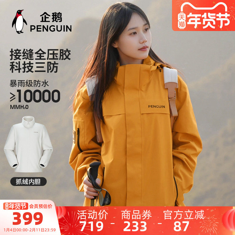 企鹅户外冲锋衣女三合一外套2025秋季新款防风防暴雨登山服远山蓝