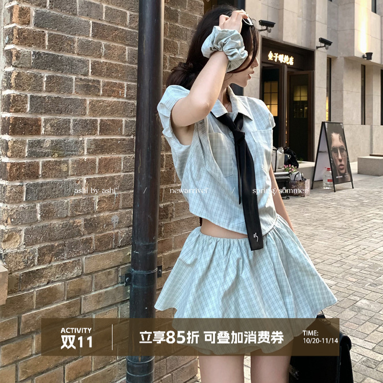 大于诗集写给少女的诗学院风短款宽松衬衫女花苞半身短裙格子套装