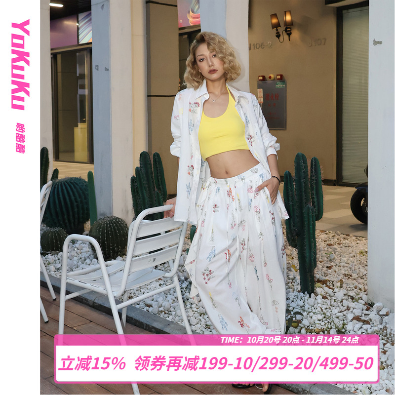 郭九九呢 100%棉简约通勤百搭宽松衬衫女秋季上衣显瘦直筒阔腿裤