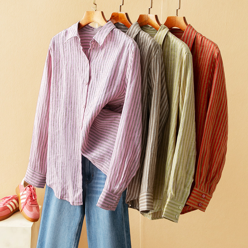 蛮文 不一样的艺术腔调 100色织亚麻复古撞色条纹宽松衬衫女58057