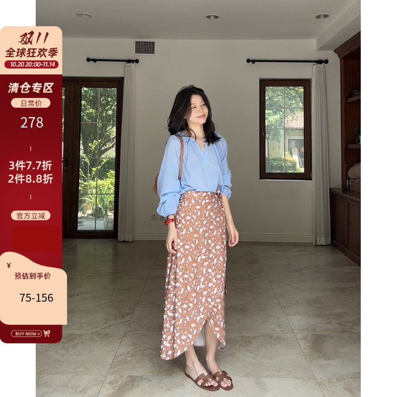 郭九九呢 100%棉v领灯笼袖宽松衬衫女夏季百搭显瘦碎花开叉半裙