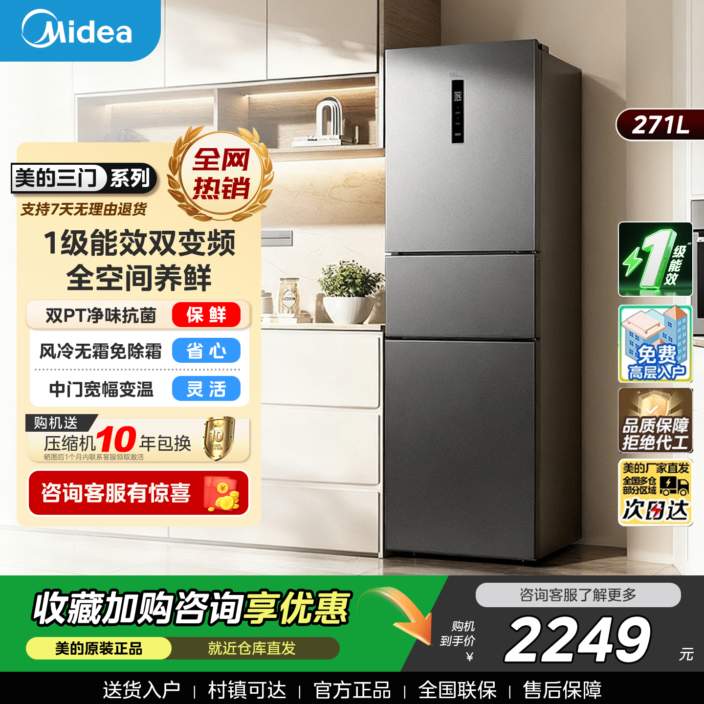 【全国补贴】美的283三门电冰箱风冷无霜变频一级能效家用小型
