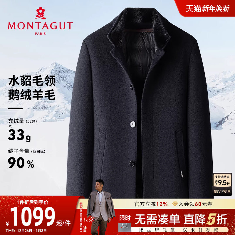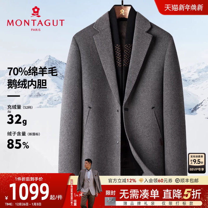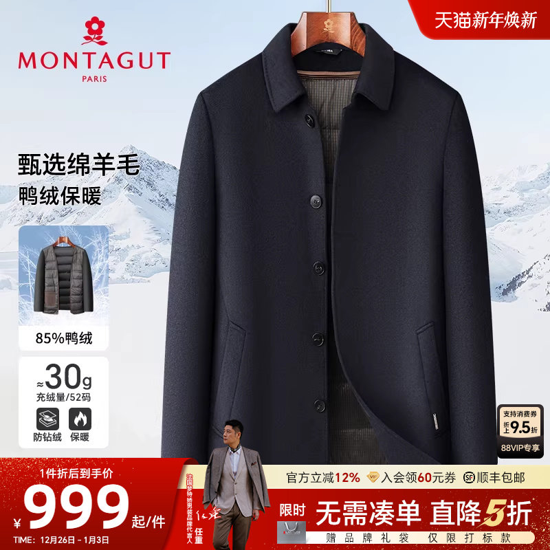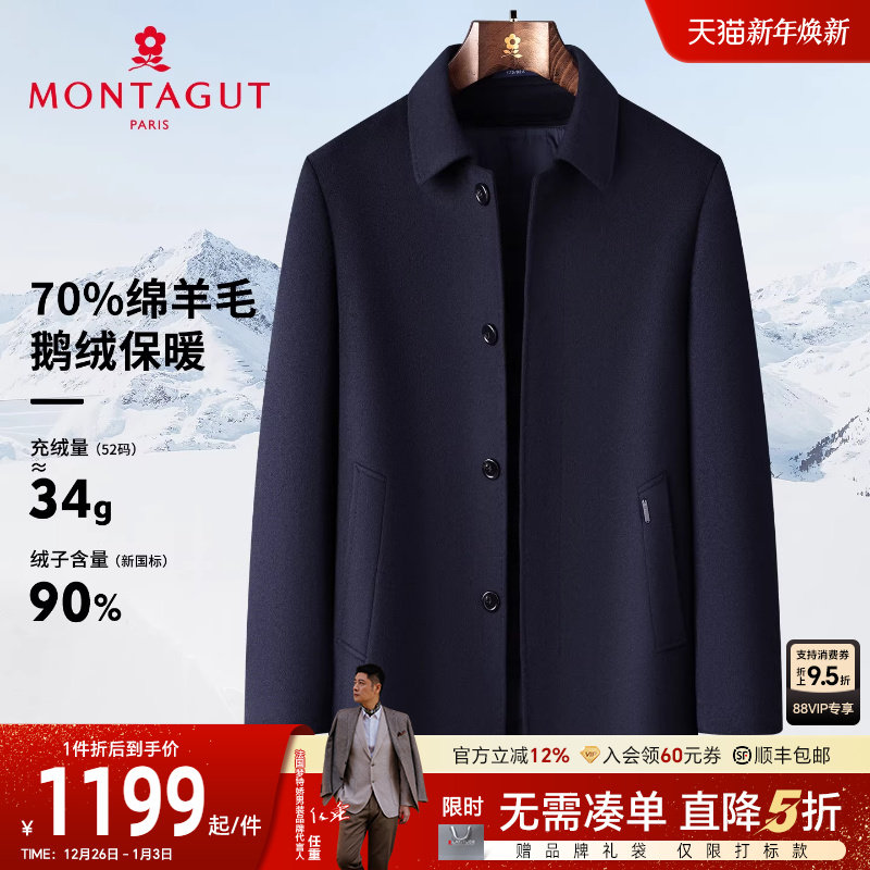 [70%羊毛/90%鹅绒]梦特娇男士羊毛呢大衣秋冬中长款两穿外套保暖J