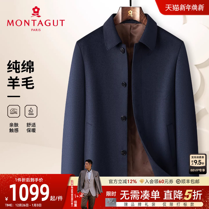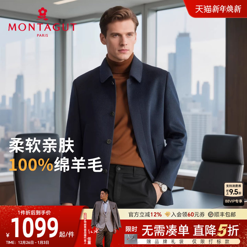 [100%羊毛]梦特娇男士纯羊毛呢大衣翻领25秋冬商务夹克外套保暖J