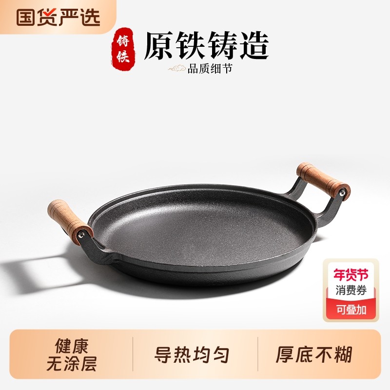 家用铸铁煎锅加厚煎饼烙饼无涂层平底锅鳌子煎饼果子生铁工具燃气