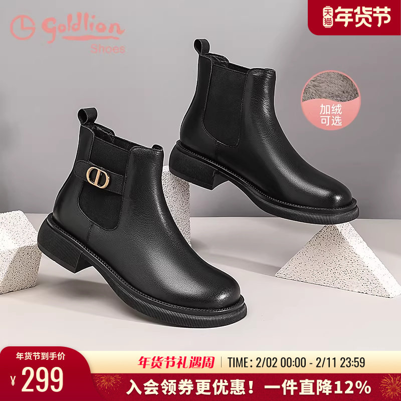 金利来切尔西靴女真皮冬季低跟百搭圆头皮靴平底女靴黑色加绒短靴