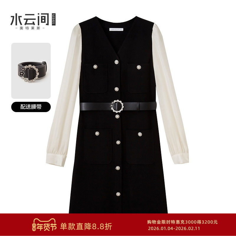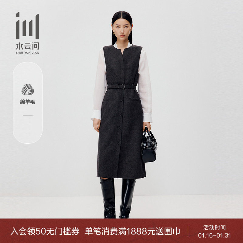 水云间女装 V领通勤简约背心羊毛直筒连衣裙附腰带2025秋季新款