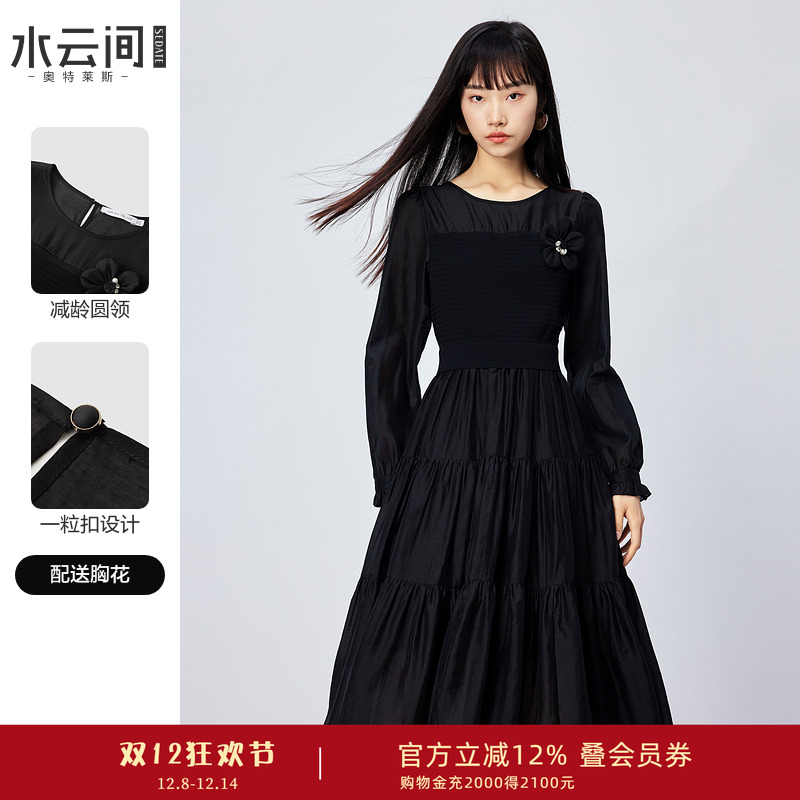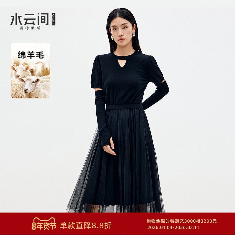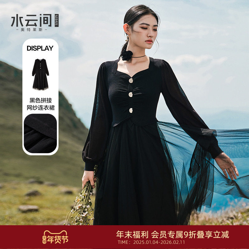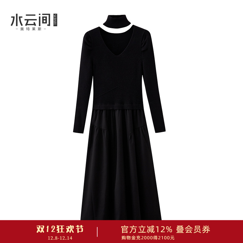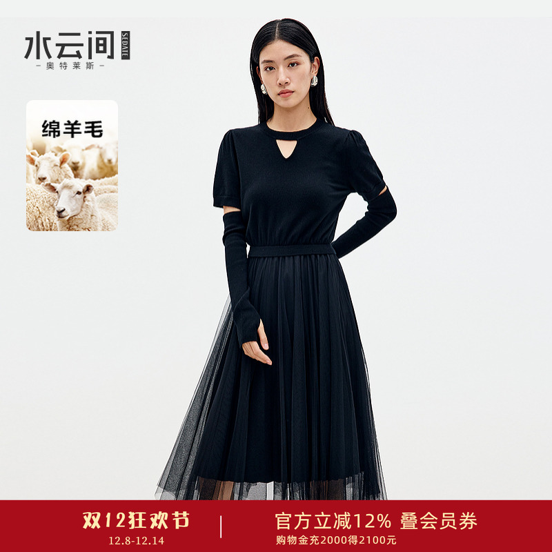 水云间黑色羊毛针织连衣裙女拼接收腰中长款纱裙显瘦气质2025新款