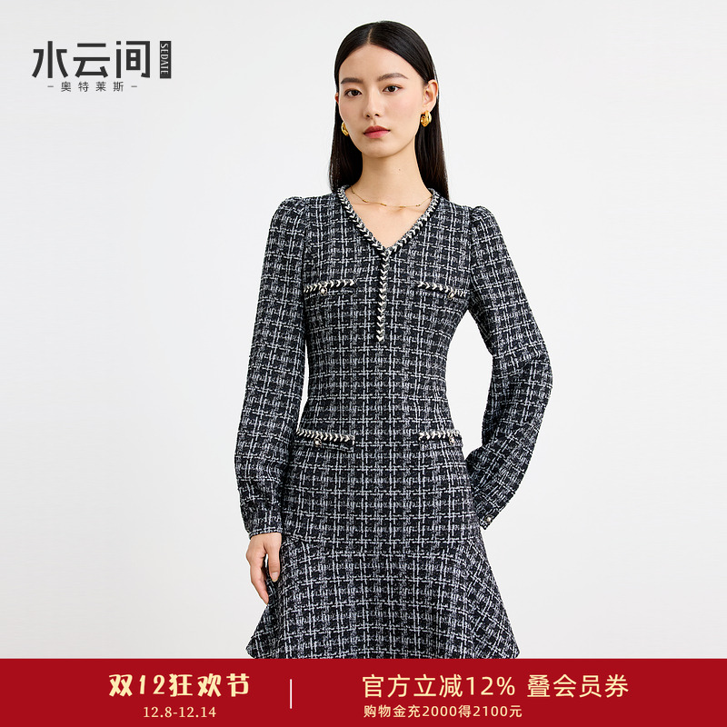 水云间黑色格纹小香风连衣裙女名媛风千金感裙V领鱼尾裙秋冬新款