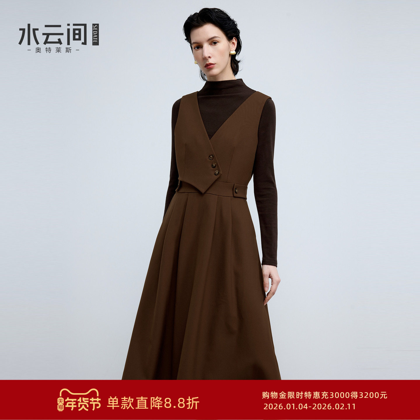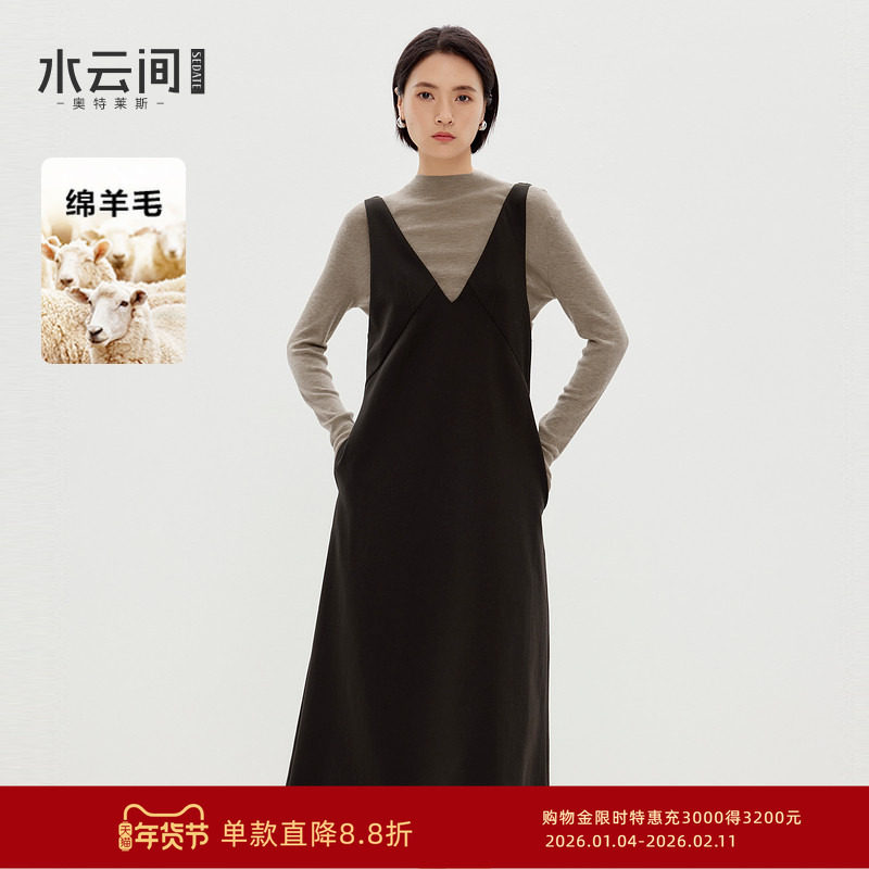 水云间女装 半高领优雅修身深咖复古拼接连衣裙马甲套装25冬新款