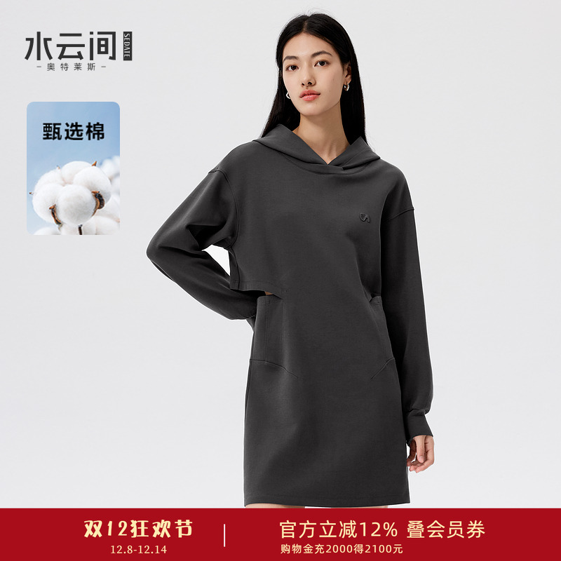 水云间黑色连帽卫衣连衣裙女中长款收腰裙子户外运动风2025秋冬款