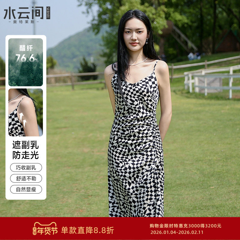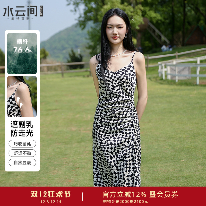 水云间黑白格纹吊带连衣裙女夏季新款2025独特设计醋酸棋盘格裙子
