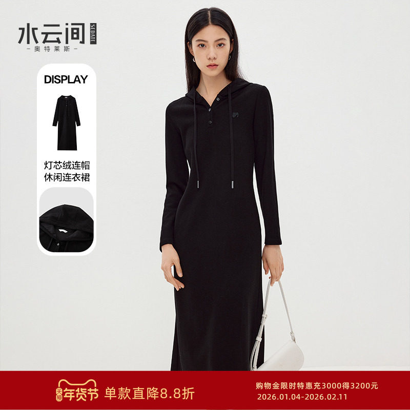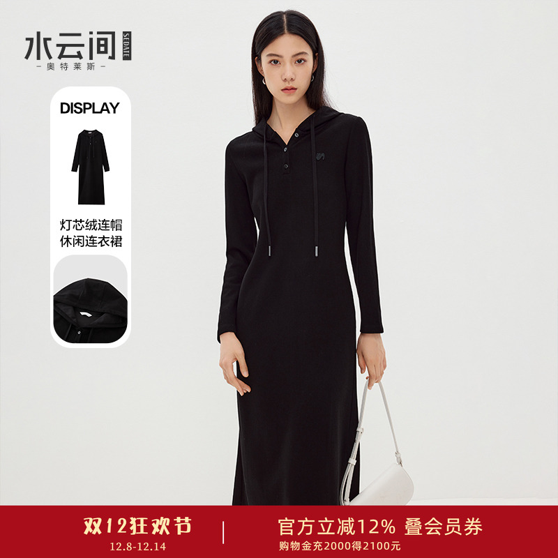 水云间黑色灯芯绒直筒连帽连衣裙女H型中长裙子冬日氛围2025新款
