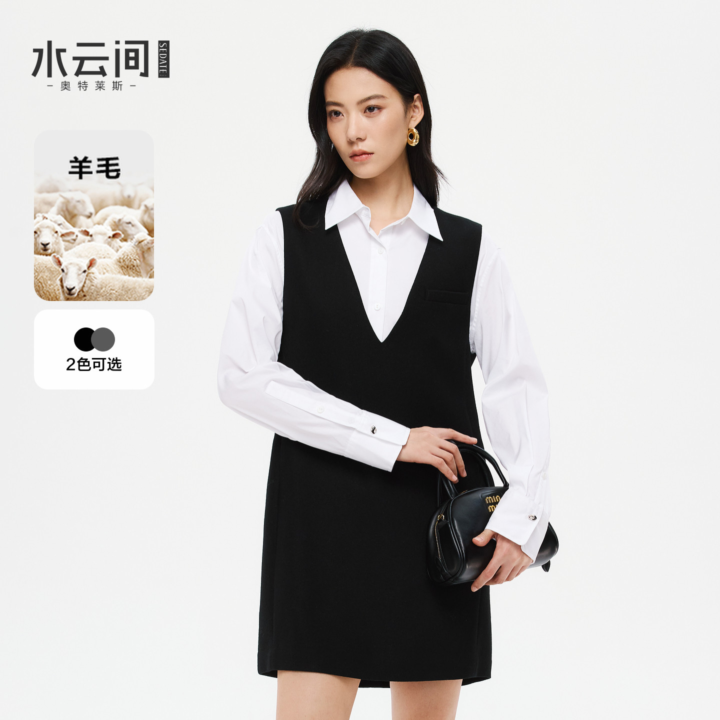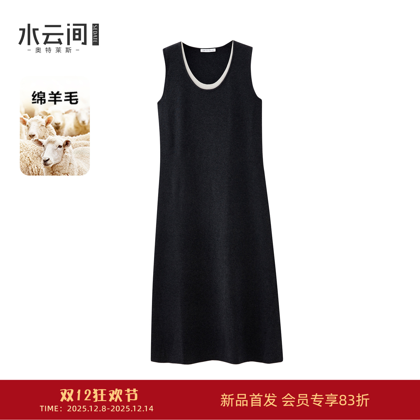 水云间U领撞色假两件背心连衣裙女羊毛混纺针织长裙子2026春新款