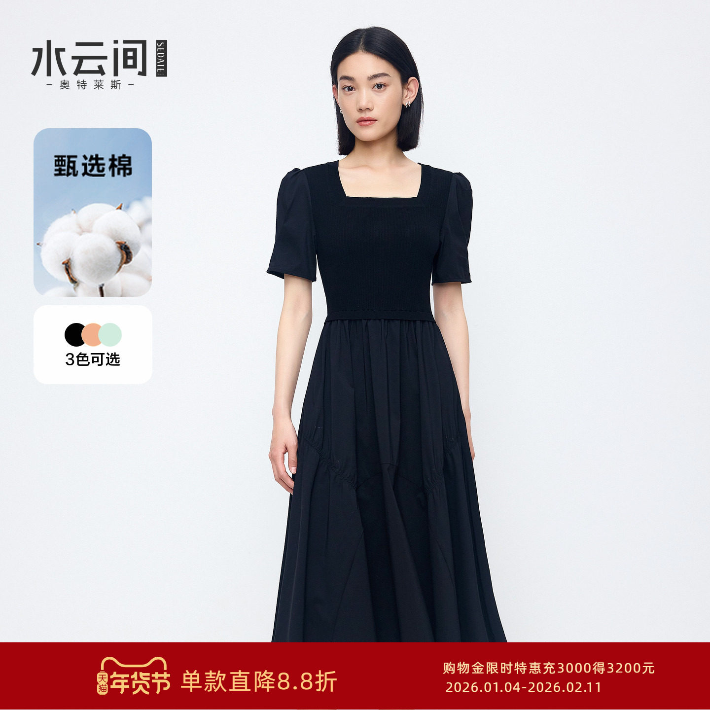 水云间u领连衣裙女中长款收腰显瘦缎面裙子拼接设计感2025夏新款