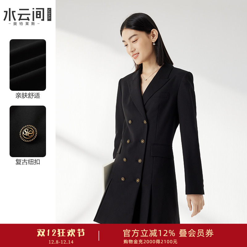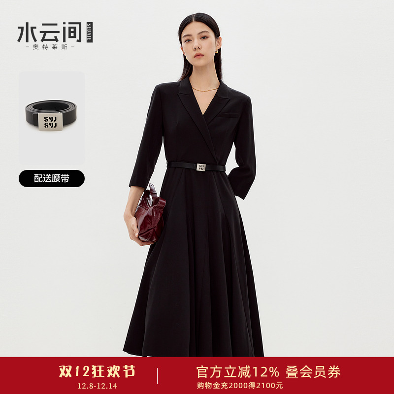 水云间黑色西装领连衣裙女七分袖v领收腰a字裙子优雅ol风2025秋款