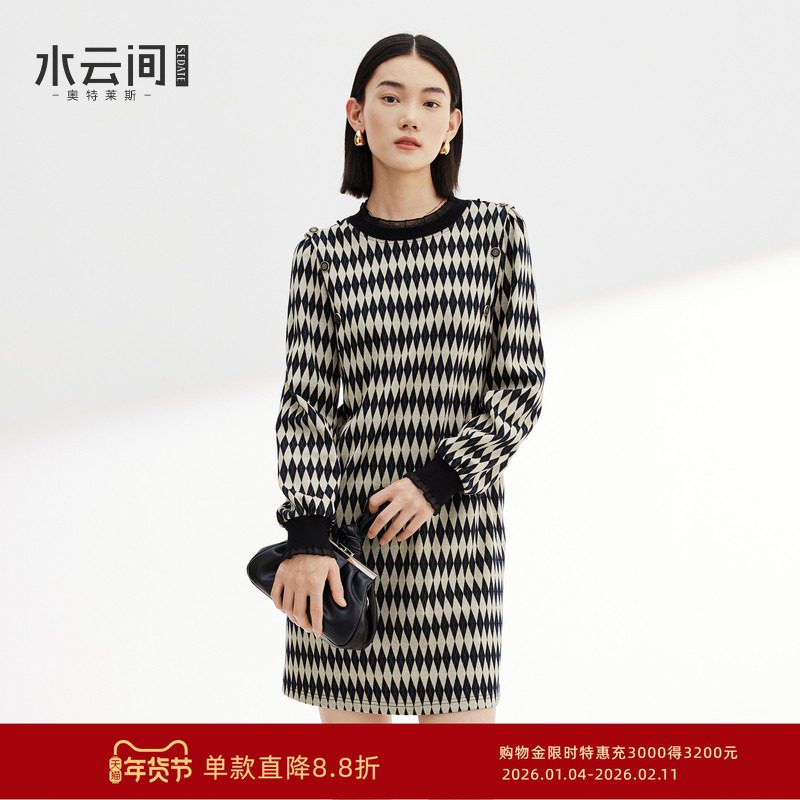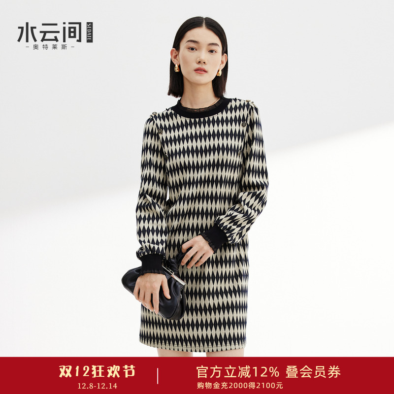 水云间菱形格纹复古连衣裙女H型针织裙子祖母衣橱风2025秋冬新款