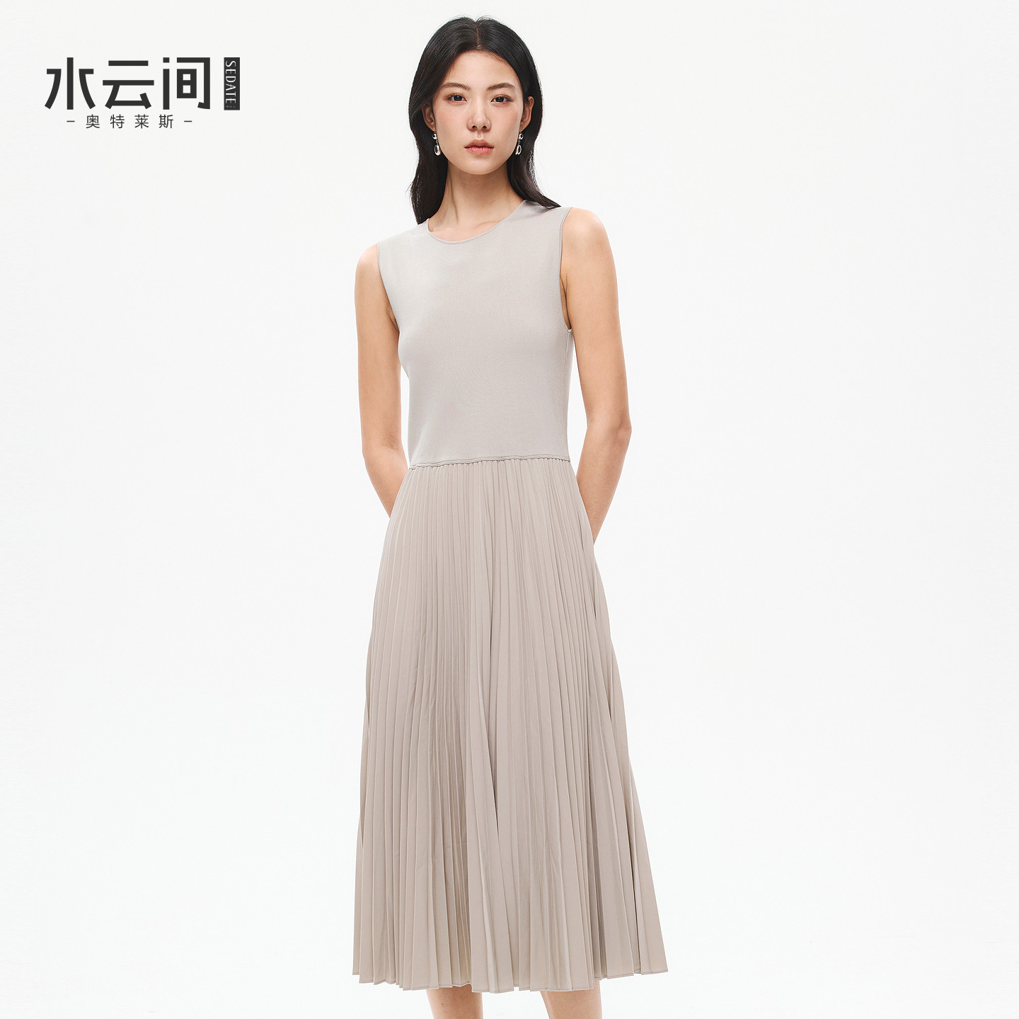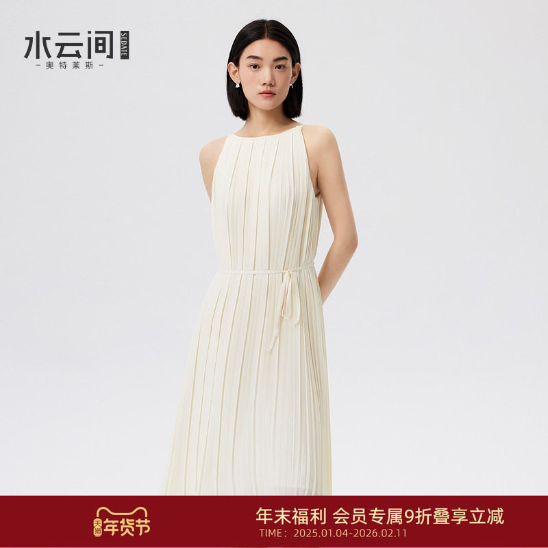 水云间杏色风琴褶连衣裙女无袖背心A字压褶长裙子高智感2026新款