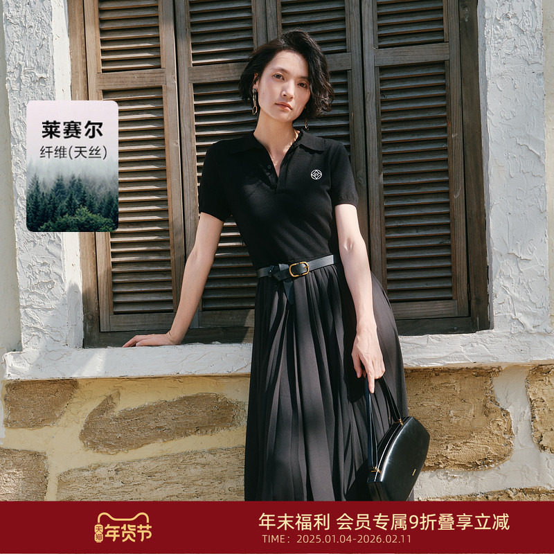 水云间短袖直筒polo领连衣裙女秋季新款2025通勤翻领针织镂空裙子