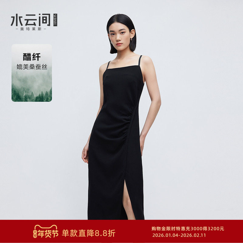 水云间黑色吊带连衣裙女收腰显瘦开叉中长裙子办公室海妖风2025夏