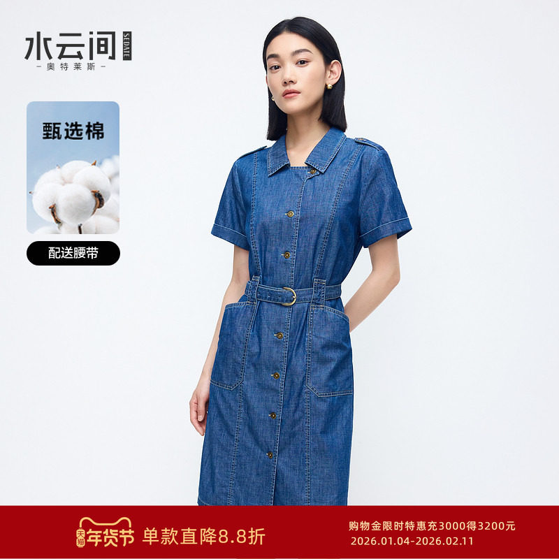 水云间蓝色牛仔连衣裙女收腰短袖衬衫领裙子纯棉轻职场2025秋新款