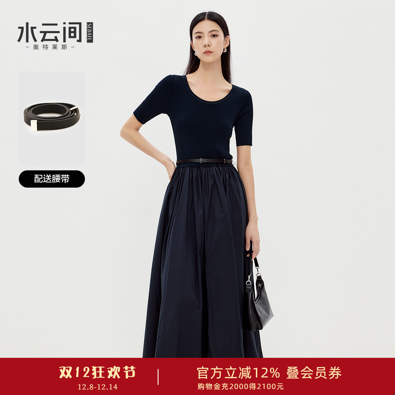 水云间黑色圆领针织拼接连衣裙女秋季新款2025莱赛尔天丝休闲裙子