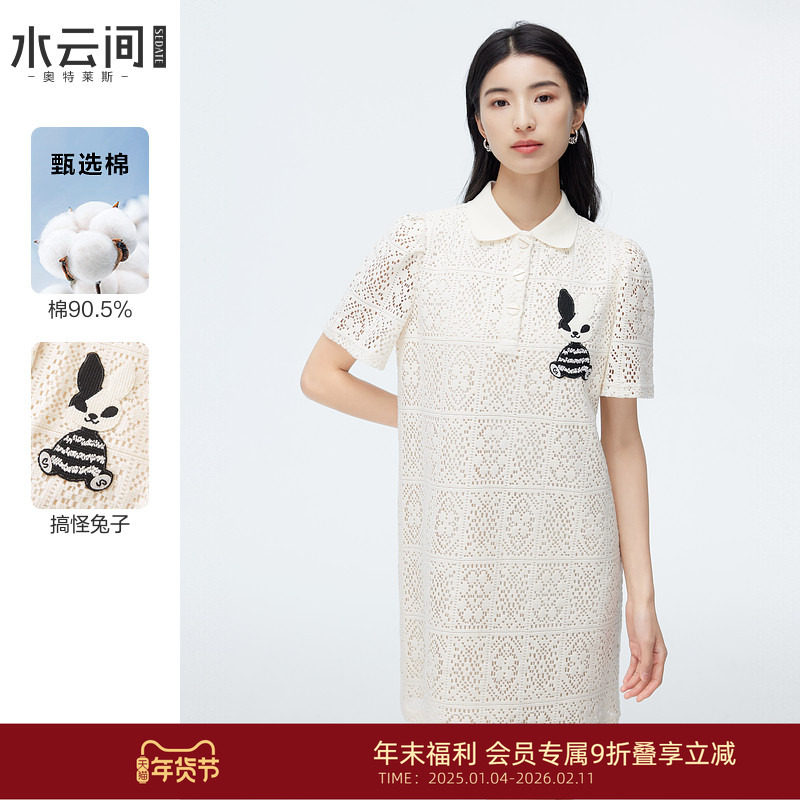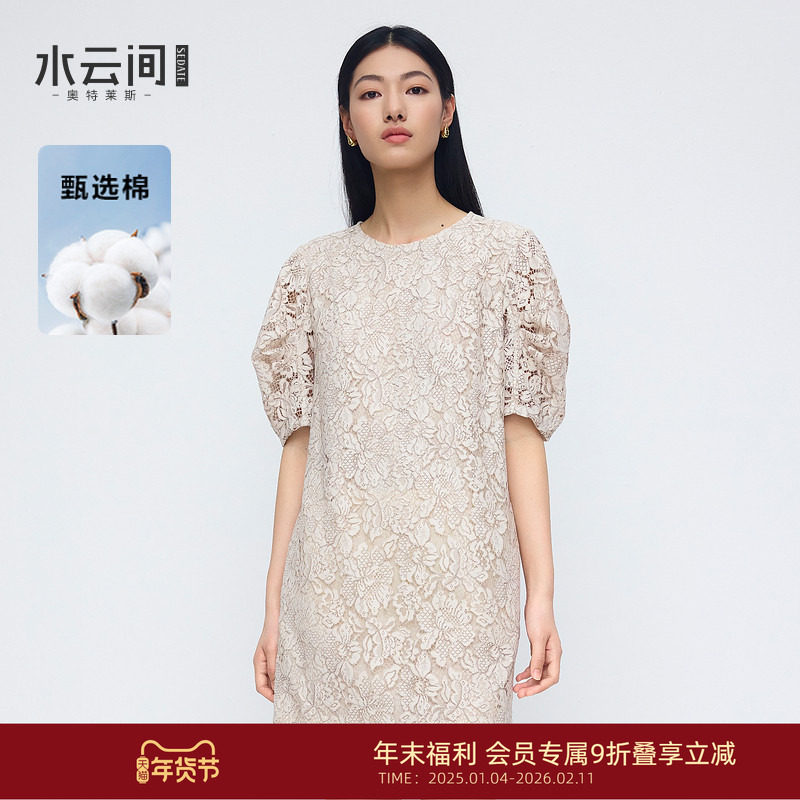 水云间杏色蕾丝钩花连衣裙女H型刺绣镂空裙子优雅端庄气质2025夏
