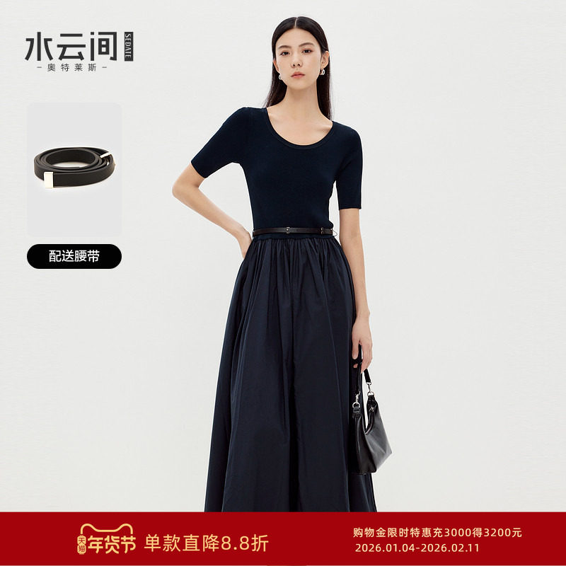 水云间黑色针织拼接连衣裙女收腰中长款压褶裙子显瘦2025夏季新款
