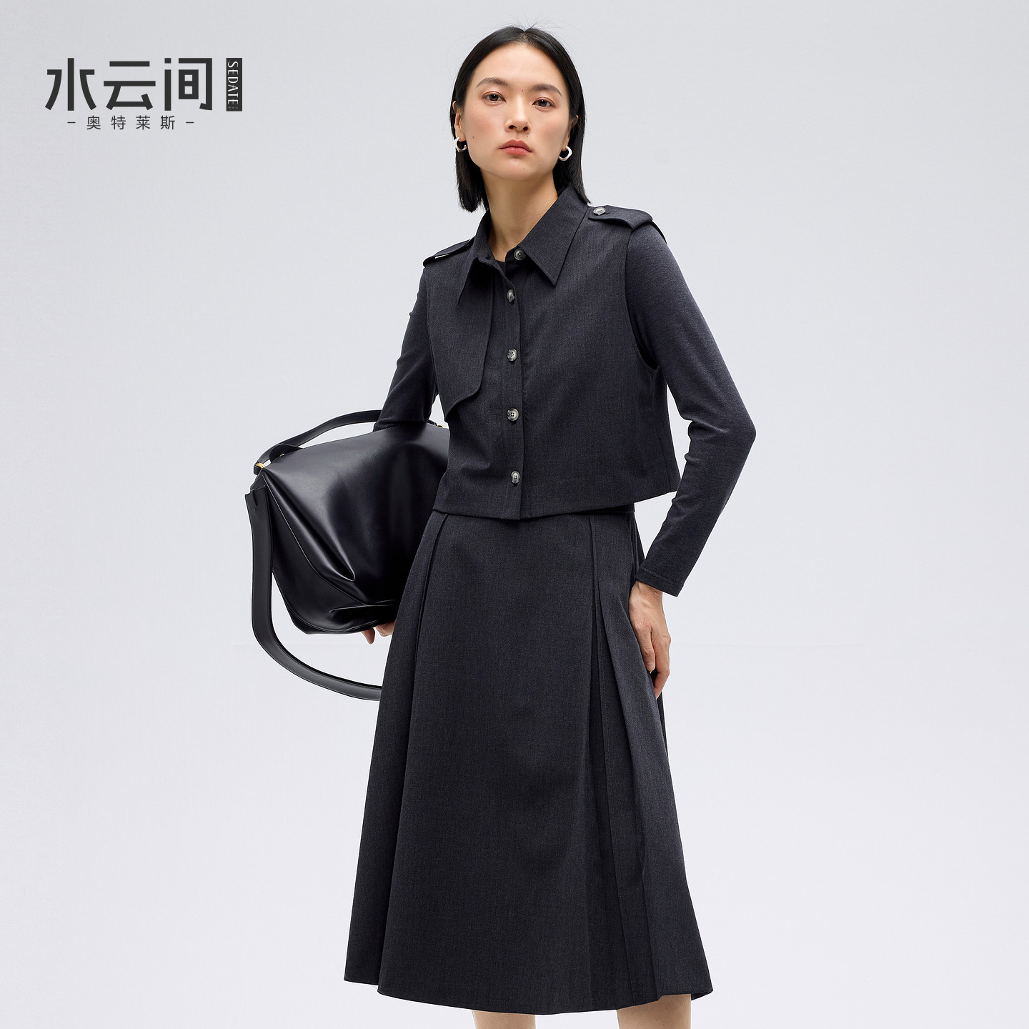 水云间深灰色静奢风长袖连衣裙女压褶伞裙子马甲外套两件套2026春