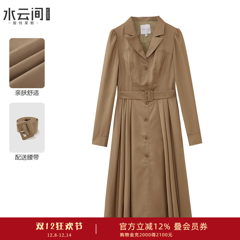 水云间卡其色中长款连衣裙女装秋季新款2025通勤长袖收腰西装裙子