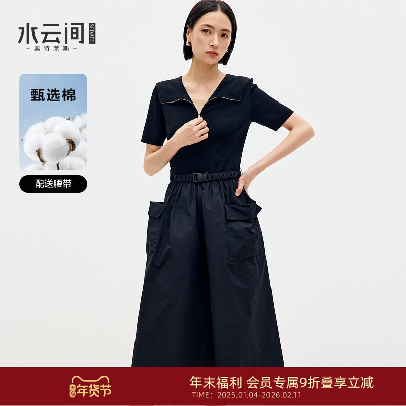水云间黑色针织拼接连衣裙女工装中长款裙子收腰显瘦2025春季新款
