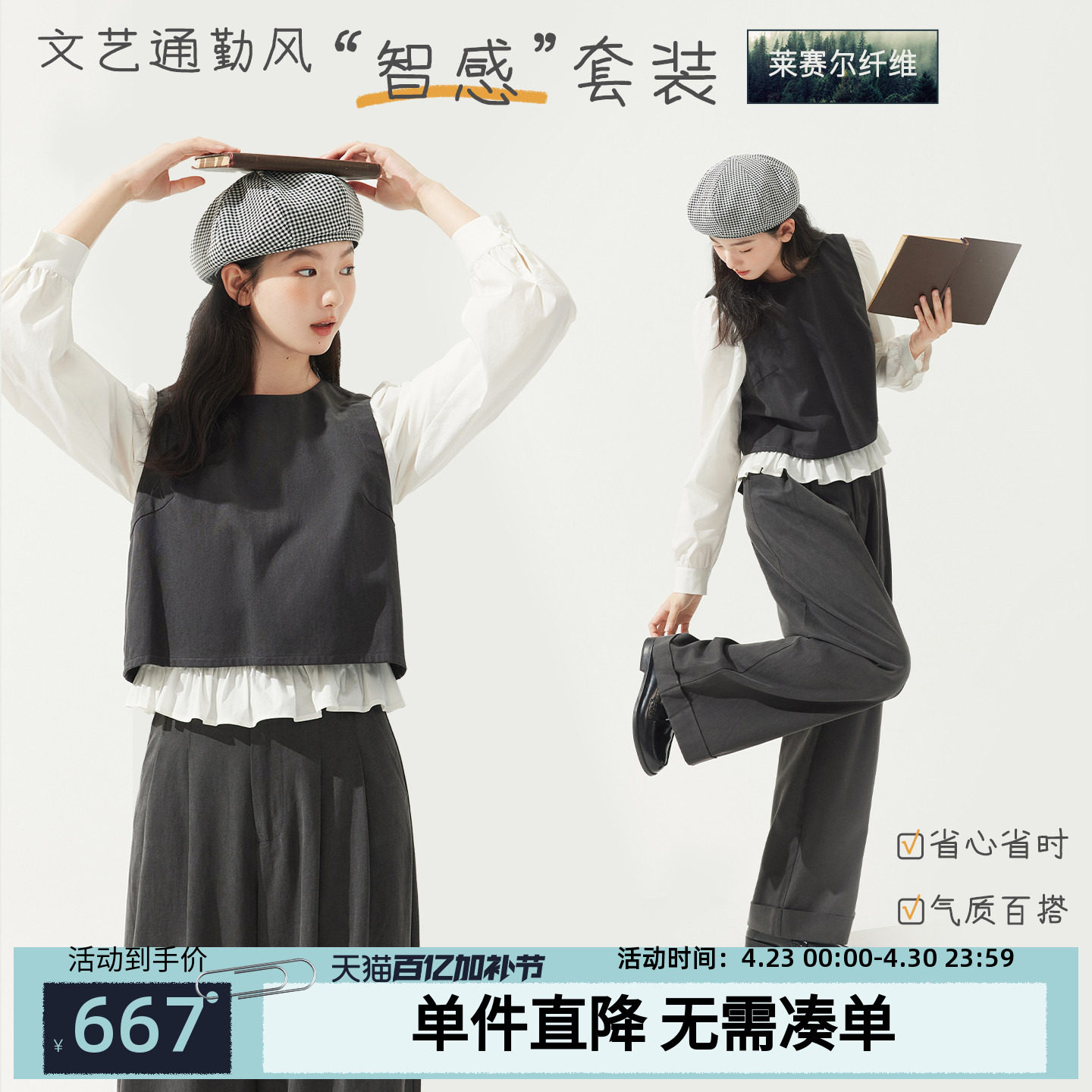 紫涵莱赛尔假两件灰色拼接上衣直筒阔腿裤上下两件套装女春季新款