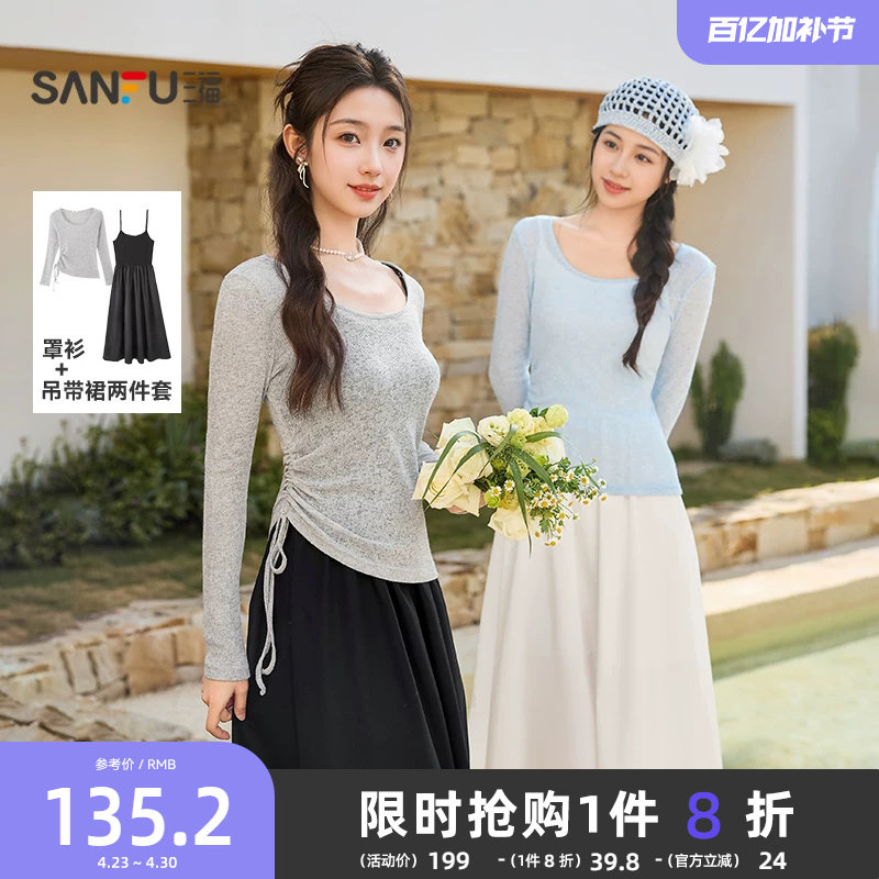 三福连衣裙套装2026新款春季抽绳收腰吊带裙罩衫两件套女装519761