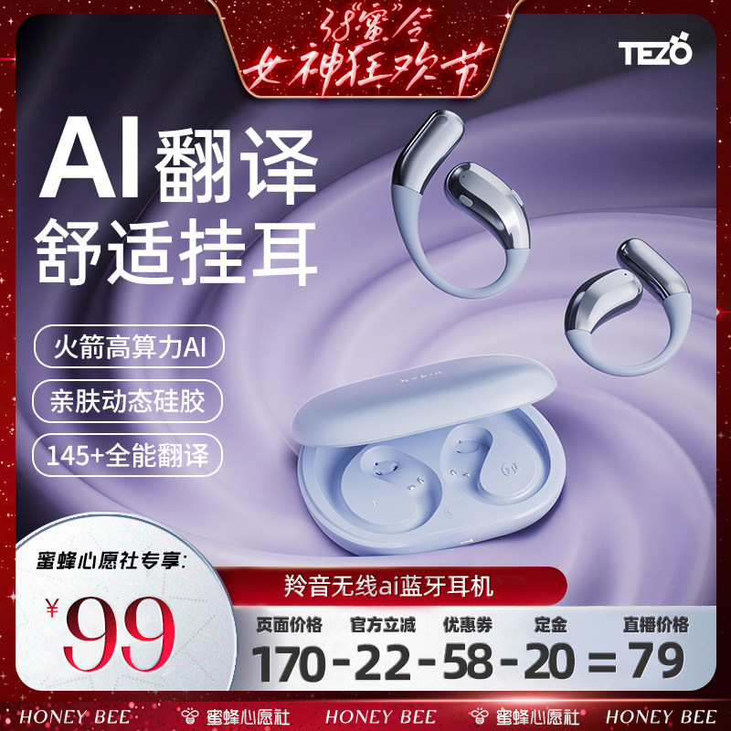 【1号0点付尾款】Tezo羚音开放式AI翻译挂耳耳机舒适运动会议录音
