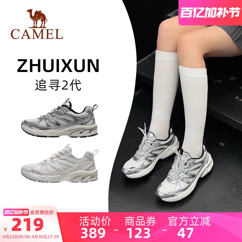 骆驼女鞋2026春季新款网面复古休闲鞋老爹鞋舒适银色运动鞋跑鞋